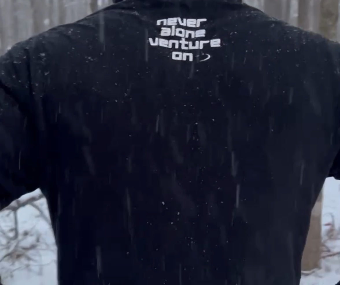 Stay bold and warm in the Navo Pullover hoodie, featuring a large logo on the front and the inspiring message "Never Alone, Venture On" on the back.